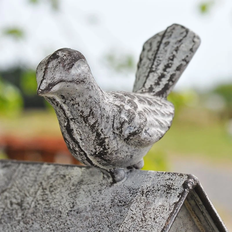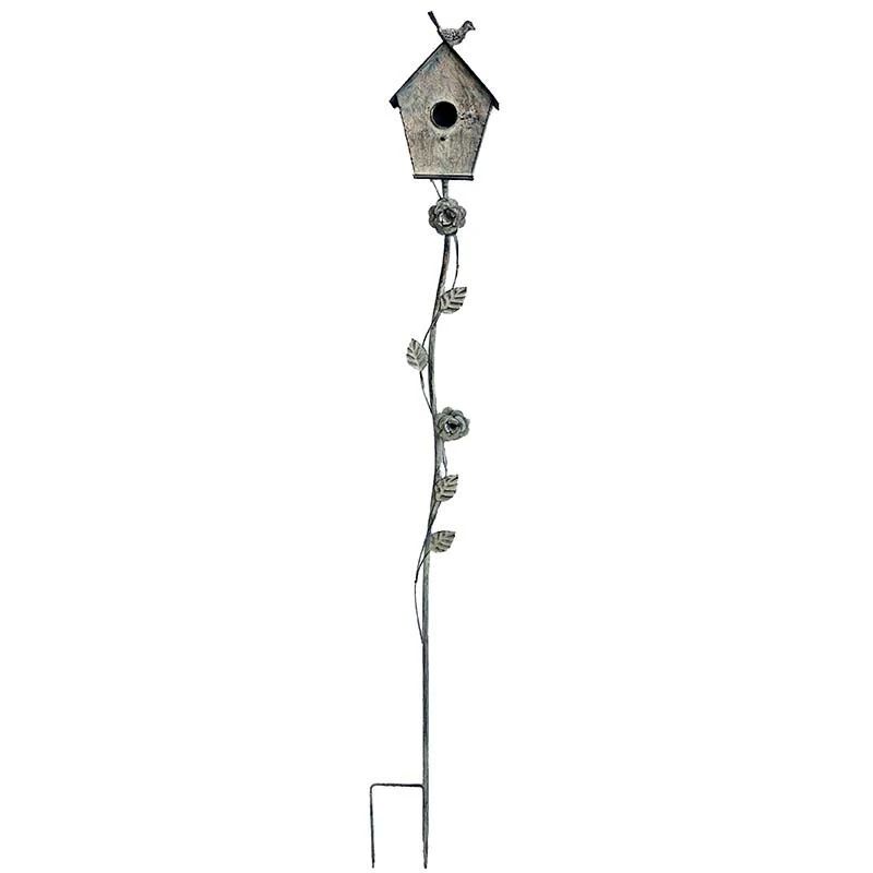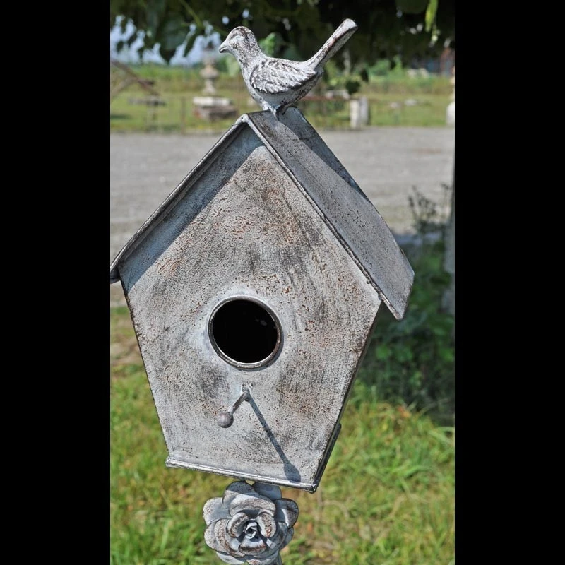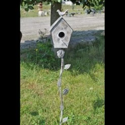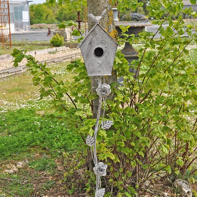 Un beau nichoir à planter dans votre jardin . On aime ses jolies lignes et sa belle patine . Vous allez faire fureur auprès des petits oiseaux! En fer gris patiné, il agrémentera de façon élégante votre jardin. Attachez des boules de graisse en façade de ce nichoir pour attirer et nourrir les oiseaux. Sa tige est ornée de sublimes roses qui apportent une touche de romantisme à ce tuteur.