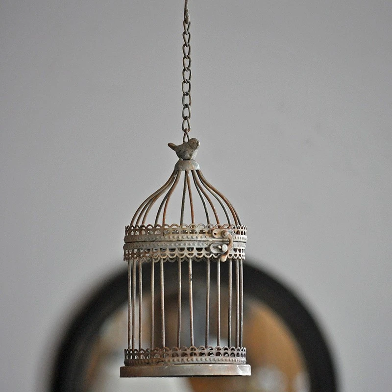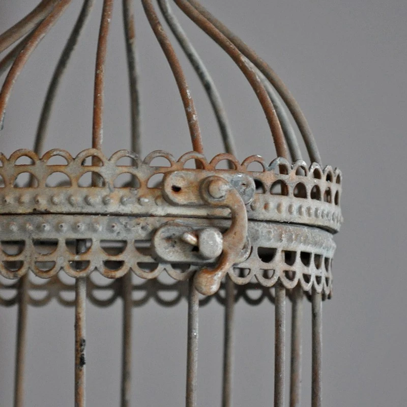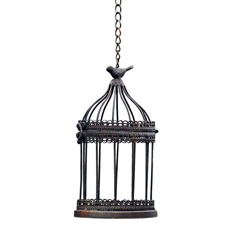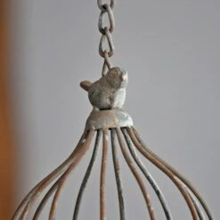 Jolie petite cage à plantes en fer à suspendre pour une décoration de jardin et de maison. Vous pouvez apercevoir un petit oiseau adorable sur le dessus de la cage à plantes. Observez les détails circulaires autour. Créez une ambiance chaleureuse et bucolique qui vous ressemble !