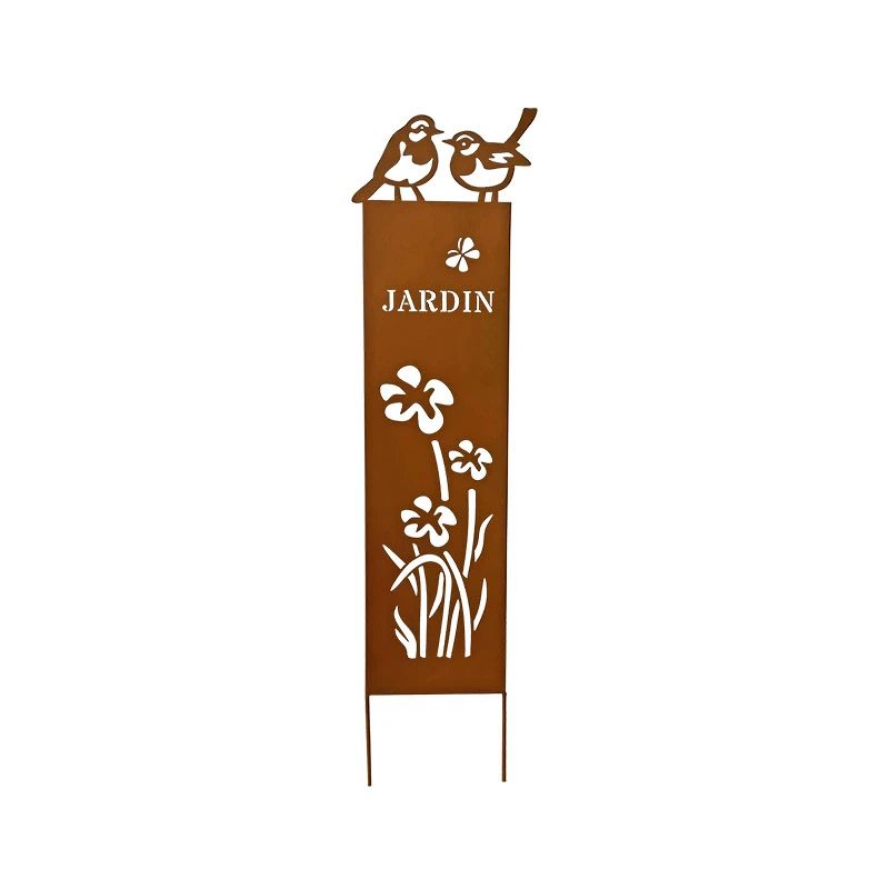 Tout en fer couleur rouille, il se décore de trois jolies fleurs, de deux sublimes oiseaux et est doté de deux pics qui vont permettront de le planter facilement dans le sol. Comme séparateur entre deux espaces, ou comme tuteur pour laisser grimper vos plantes, ce grand treillage sera autant utile que décoratif.